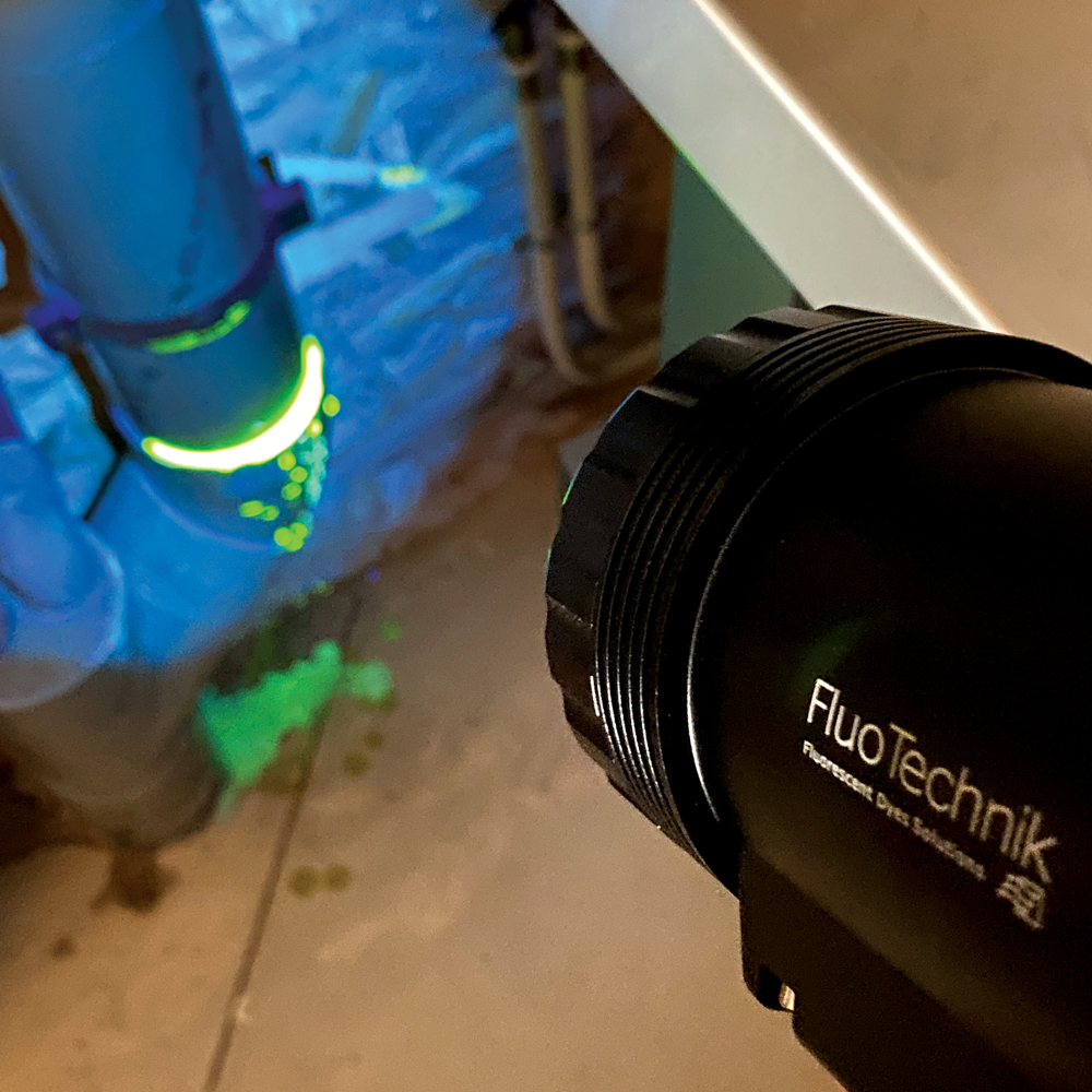 Dans les systèmes de plomberie et canalisation, la fluorescéine aide à localiser les fuites. En injectant la substance dans le système, les fuites peuvent être identifiées par l'apparition de la couleur verte caractéristique en dehors des conduites.