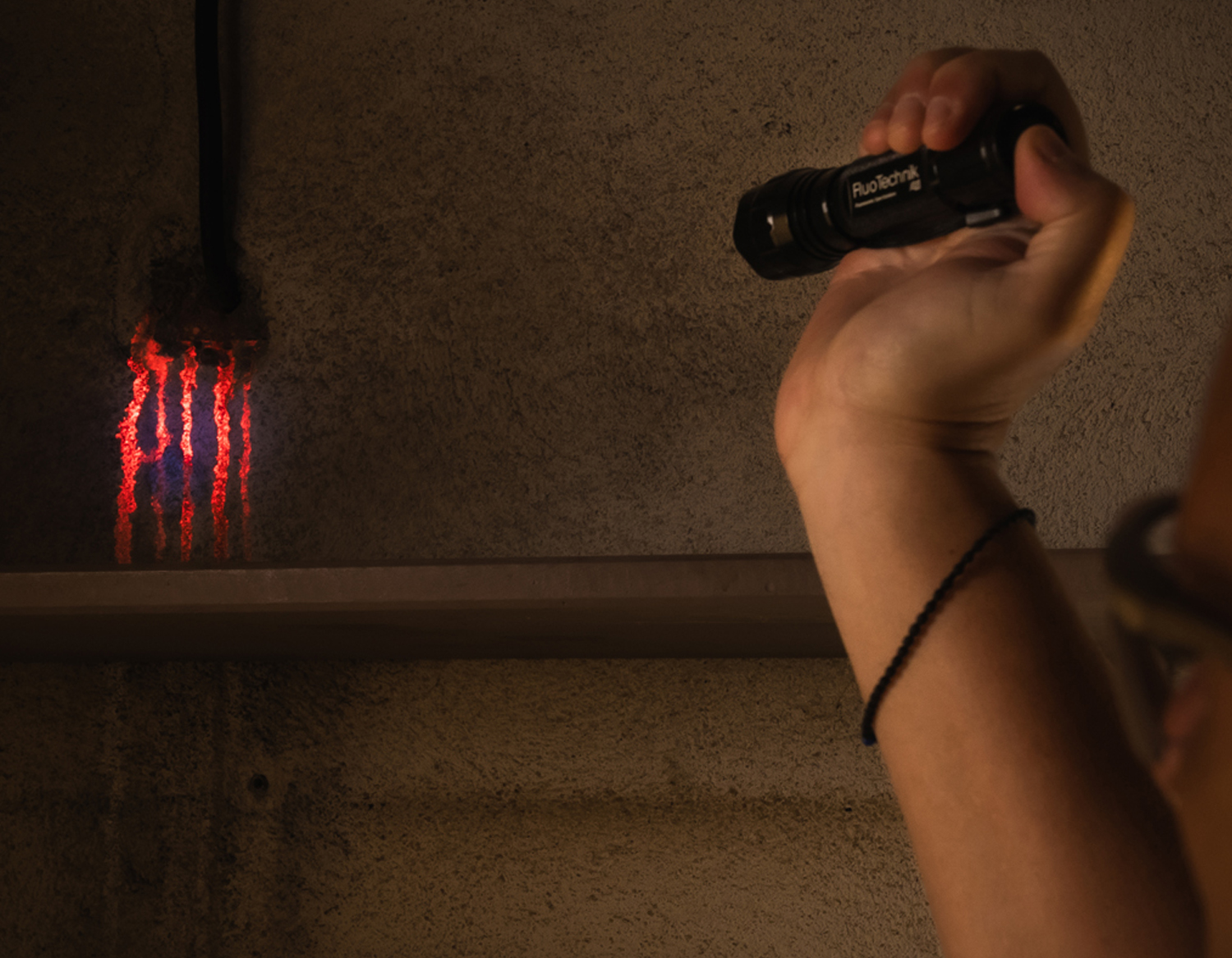 Après circulation du colorant, éclairez la zone suspecte avec la lampe UV.